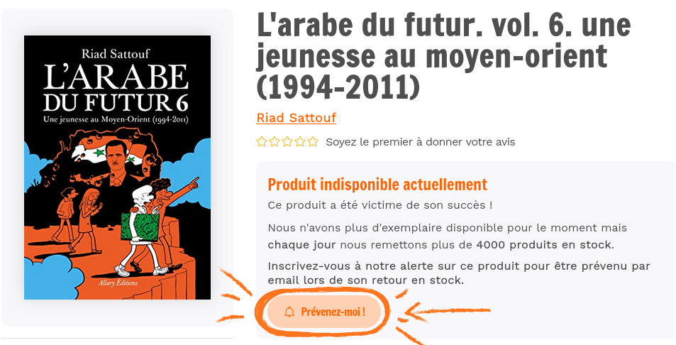 Chez Recyclivre, nous vendons 4000 livres par jour et en ajoutons autant de nouveaux dans les rayons de notre entrepôt ! Avec un tel roulement, le livre que vous cherchez n’est sûrement pas loin. Pour être au courant de son retour dès qu’il est disponible à nouveau, nous avons créé la fonction « Prévenez-moi ! » : il vous suffit de noter votre adresse mail, et vous recevrez un message dès que l’ouvrage convoité sera en stock.