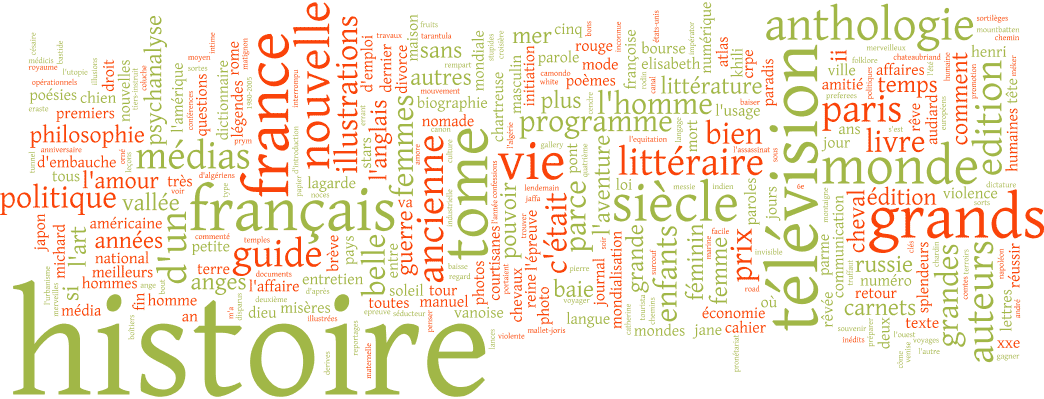 Je me suis amusé à récupérer tous les mots présents dans les différents titres des livres en stock. Je les ai importés sur many eyes. Puis après quelques manipulations, voilà la belle représentation que cela m’a donnée.