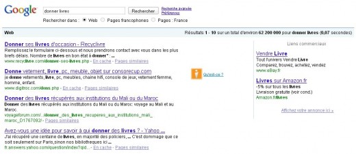 En tapant « Donner livres » sur google.fr, c’est la première place qui nous attends, sur un total de 62 200 000 pages référencées.